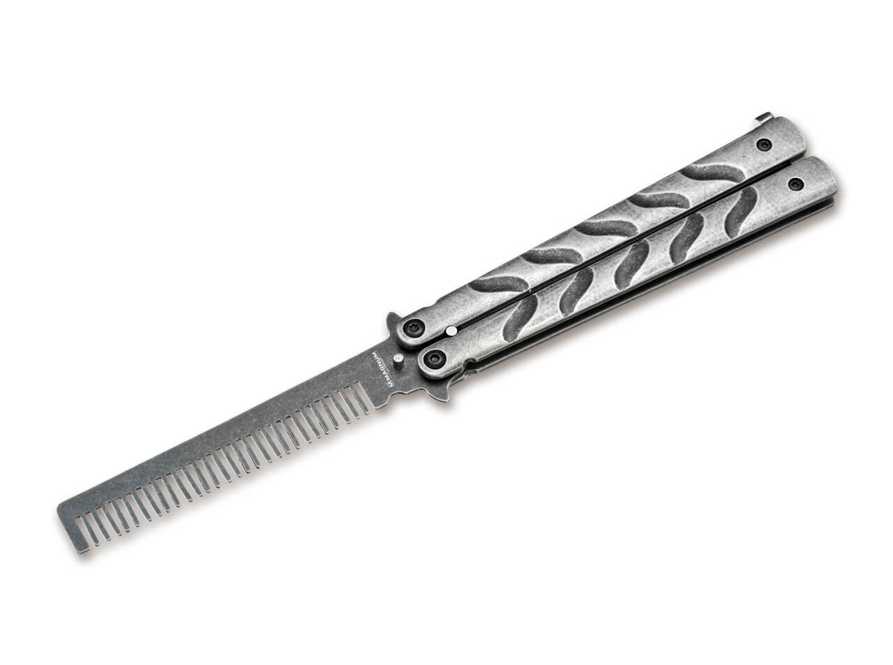 The Asian balisong has an unmistakable presence even in the shape of a comb. The comb and the bisected handle are made of stainless steel with a dark stonewash finish. This turns combing a straight part almost into a tactical task.