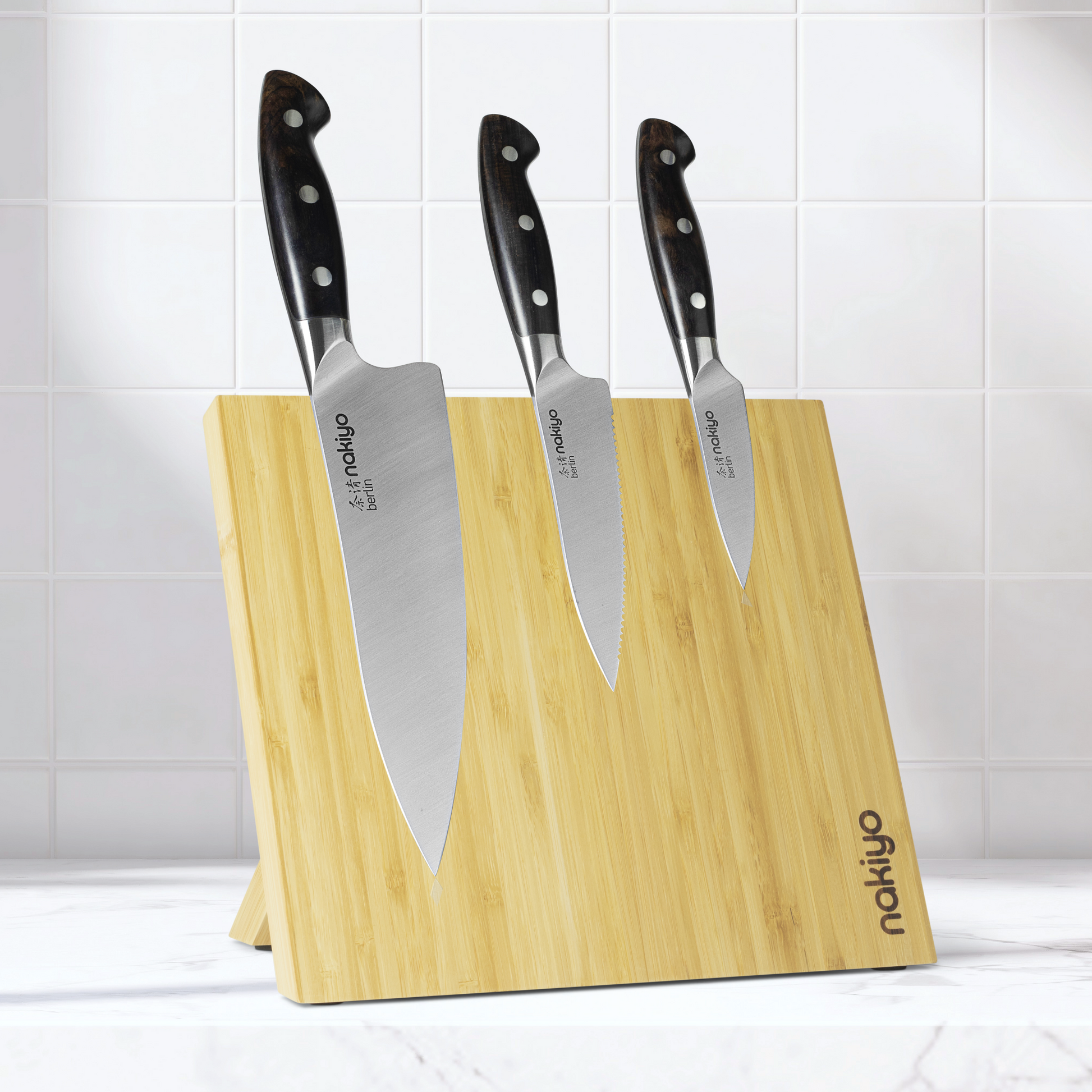 It also comes with a complimentary magnetic bamboo knife stand our very own design, normally $49.90, as our gift to you. It stands freely on your counter and securely holds up to five knives with blades of up to 9.5". We offer it in two shades—pick your favorite!