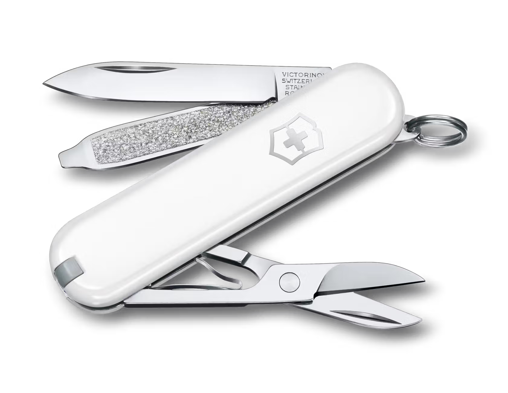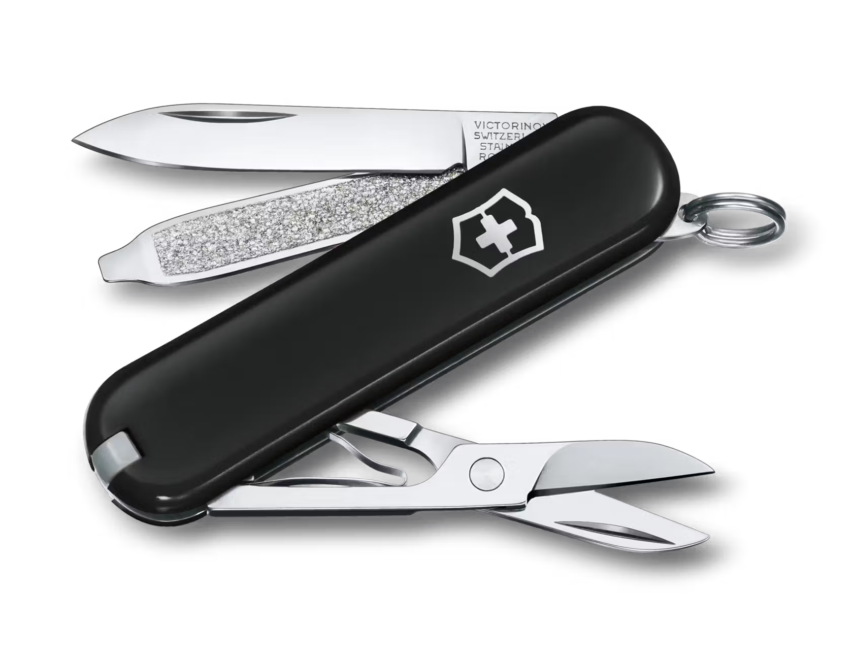 Functions: Blade, small / Scissors / Key ring / Tweezers / Toothpick / Nail file / Screwdriver 2.5 mm
